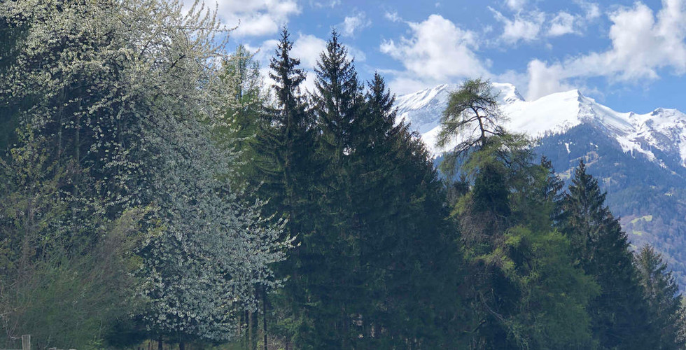 Am nächsten Waldrand blühen schon die Wildkirschen und strahlen mit der grün-braunen Farbenpracht um die Wette.